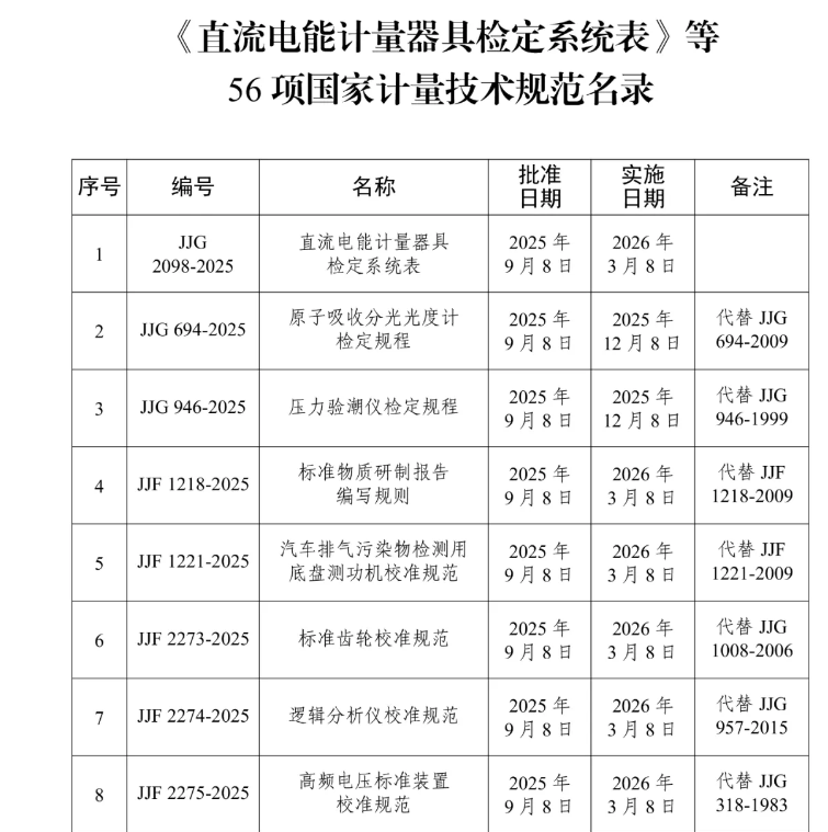 近日,市场监管总局批准《直流电能计量器具检定系统表》等56项国家计量技术规范发布实施。