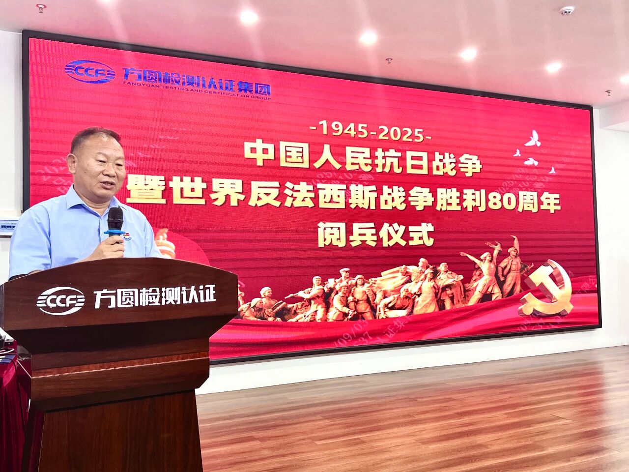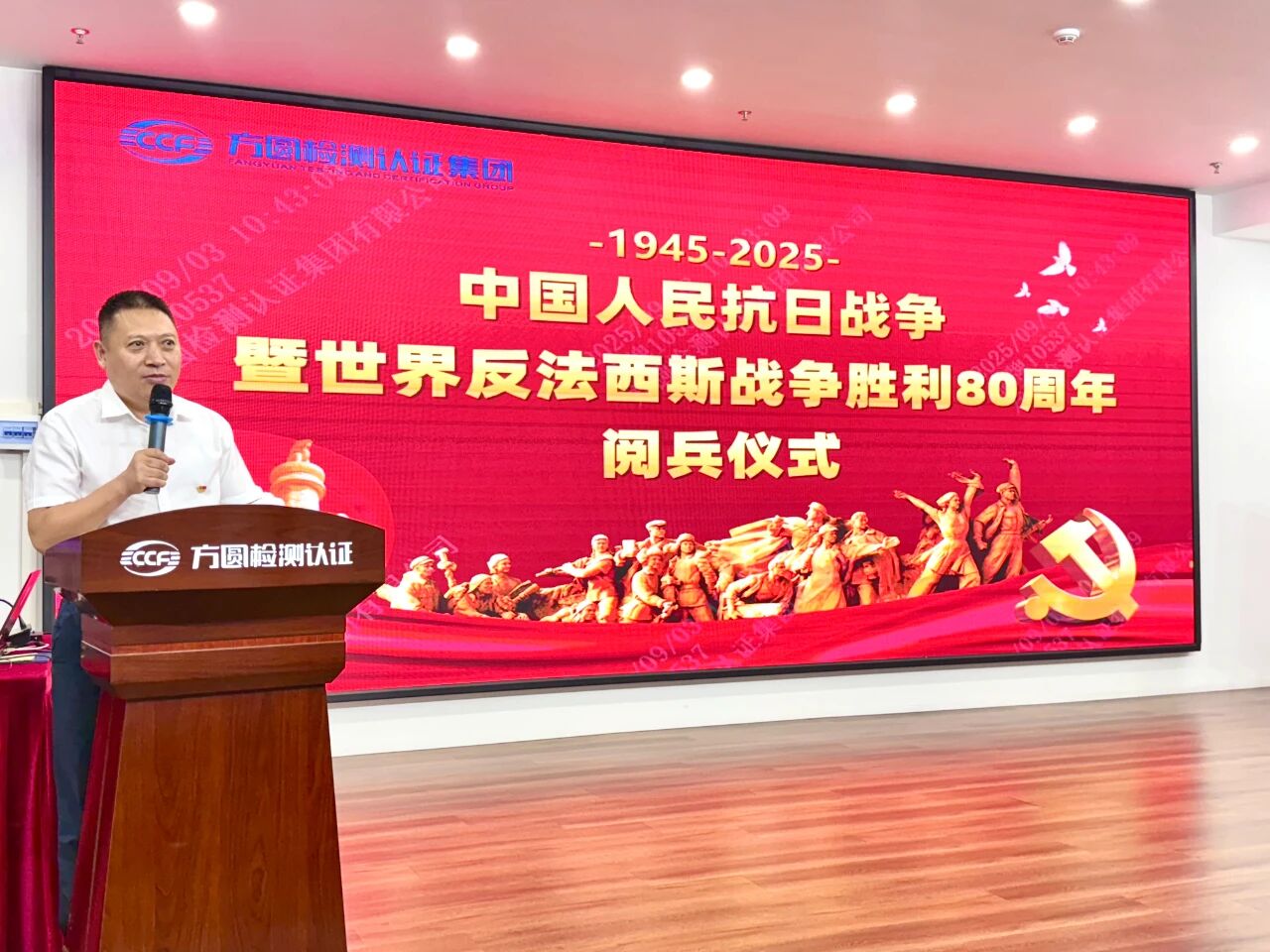 最后,集团董事长滑景义作总结讲话。他指出,在中国人民抗日战争暨世界反法西斯战争胜利80周年之际,国家举办庄重盛大的阅兵仪式,不仅展示了中国日益强大的综合国力,更传递出中国维护世界和平、守护历史正义的坚定决心,极大激发了全体中华儿女的民族自豪感与爱国情怀。“方圆检测认证集团从成立到发展壮大,始终扎根在国家政策的沃土中,离不开党的领导与国家对企业的扶持。”滑总强调,全体员工要始终牢记“企业发展与国家命运同频共振”的初心,将感恩国家、报效国家的精神融入日常工作的每一个环节,以专业的服务、严谨的态度提升企业竞争力,共同推动集团发展壮大,更好地为强国建设、民族复兴伟业贡献企业力量。