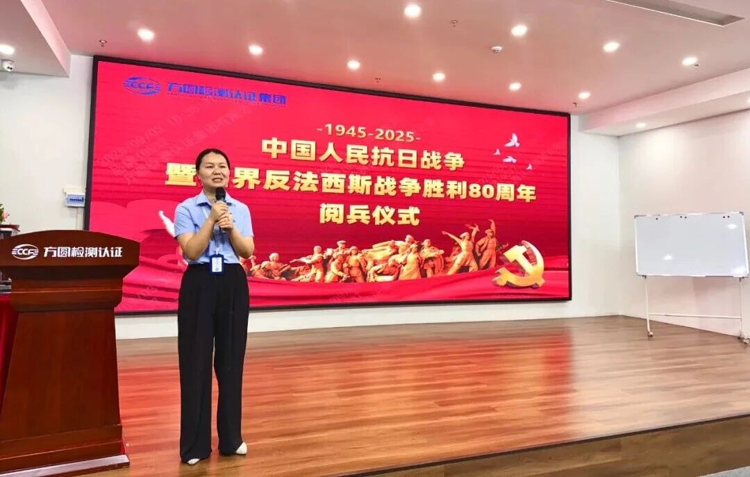 习近平主席指出:“铭记历史不是为了延续仇恨,而是为了更好地开创未来。”在这个特殊的时刻,组织集体观看阅兵仪式活动,是方圆检测认证集团深化爱国主义教育、传承红色基因的重要举措。集团将以此次活动为契机,持续开展红色主题学习,引导全体员工从历史中汲取奋进力量,把爱国情、强国志转化为报国行,以实干担当推动集团高质量发展,为实现中华民族伟大复兴的中国梦添砖加瓦。