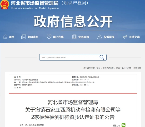 近日,河北省市场监督管理局发布公告撤销石家庄西腾机动车检测有限公司、张北众仁机动车检测有限公司等2家检验检测机构资质认定证书。