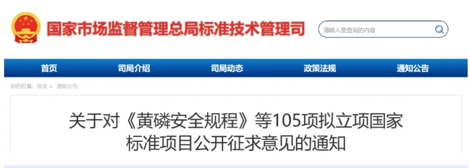 日前,《关于对〈黄磷安全规程〉等105项拟立项国家标准项目公开征求意见的通知》正式发布。具体内容如下: