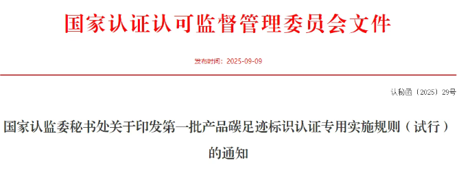 近日,国家认监委制定并印发第一批17种产品碳足迹标识认证专用实施规则(试行)。