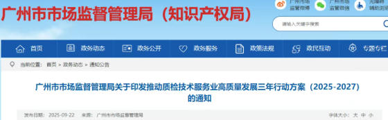 广州市市场监督管理局关于印发推动质检技术服务业高质量发展三年行动方案(2025-2027)的通知