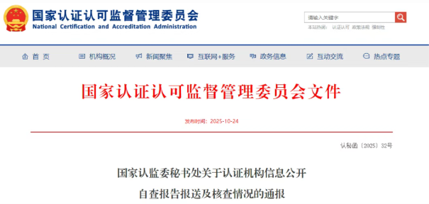 为进一步规范认证机构信息公开工作,强化认证活动规范性,提高认证结果公信力,国家认监委秘书处于2025年4月印发了《国家认监委秘书处关于进一步规范认证机构信息公开工作的通知》(认秘函〔2025〕13号),要求各认证机构严格对照法规要求开展信息公开自查整改并报送自查报告。现将自查报告报送及核查情况通报如下: