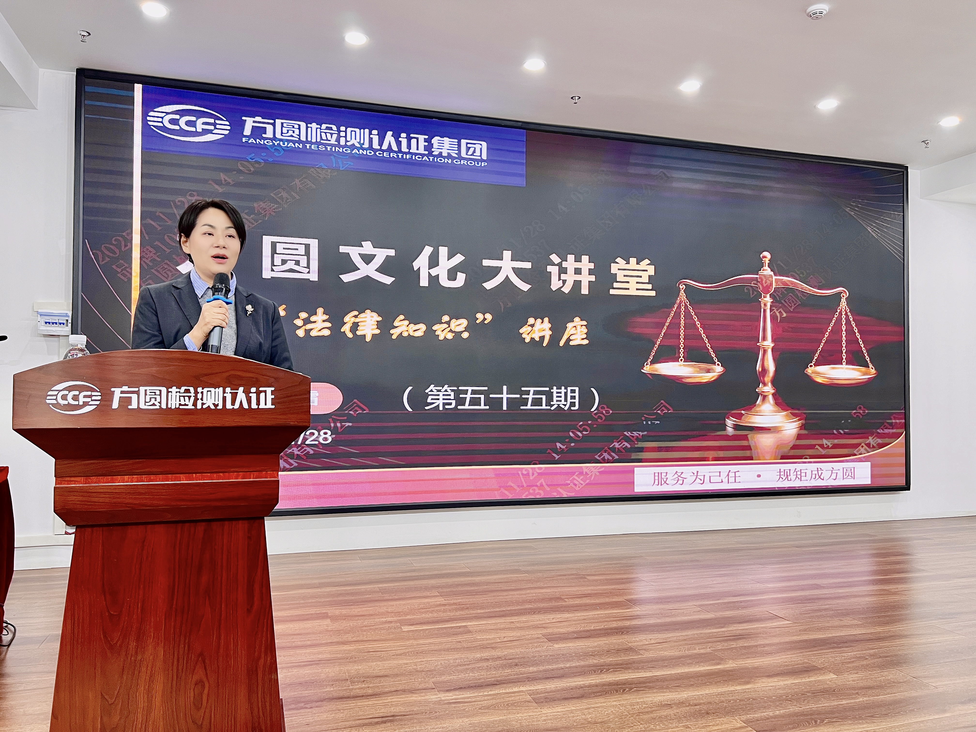 为帮助员工树立“学法、懂法、守法、用法”的牢固观念,进一步提升员工识别、规避及应对法律风险的能力,筑牢企业合规经营“防火墙”,2025年11月28日下午,方圆检测认证集团举办了第五十五期“方圆文化大讲堂”。本期讲堂特邀集团法律顾问张霜律师担任主讲嘉宾,围绕法律知识普及与风险防范,为全体员工带来了一场深入浅出,内容详实的专题讲座。