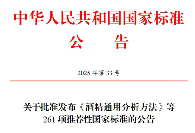近日,国家市场监督管理总局(国家标准化管理委员会)批准发布《酒精通用分析方法》等261项推荐性国家标准。关于批准发布《酒精通用分析方法》等261项推荐性国家标准的公告国家...