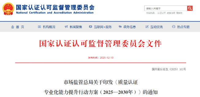 据国家认监委官网消息,市场监管总局印发《质量认证专业化能力提升行动方案(2025—2030年)》,全文如下:国市监认证发〔2025〕101号市场监管总局关于印发《质量认证专业化能力...