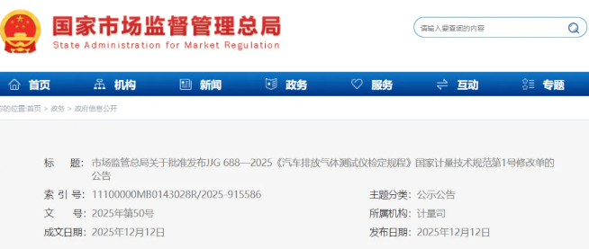 近日,市场监管总局批准发布JJG 688—2025《汽车排放气体测试仪检定规程》国家计量技术规范第1号修改单。详情如下:市场监管总局关于批准发布JJG 688—2025《汽车排...