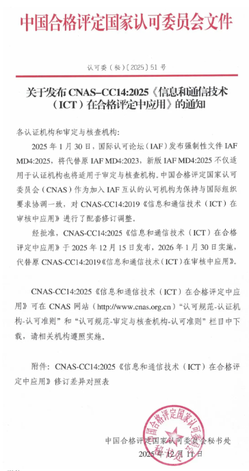 近日,中国合格评定国家认可委员会(CNAS)发布CNAS-CC14:2025《信息和通信技术(ICT)在合格评定中应用》,详情如下:...