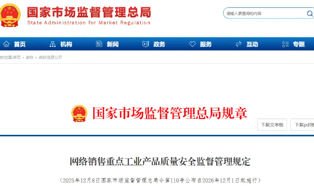 近日,市场监管总局发布《网络销售重点工业产品质量安全监督管理规定》(以下简称《管理规定》),将自2026年12月1日起正式施行。《管理规定》所称网络销售重点工业产品,包括实施工...