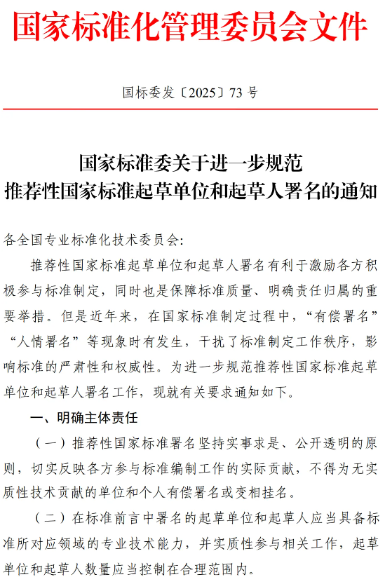 近日,国家标准委印发《关于进一步规范推荐性国家标准起草单位和起草人署名的通知》,要求各全国专业标准化技术委员会坚持实事求是、公开透明原则,不得为无实质性技术贡献的单位...