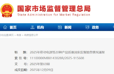 近日,市场监管总局组织开展移动电源等20种产品质量国家监督抽查。本次共抽查20种产品1107批次,在天猫、京东、抖音、拼多多、淘宝、快手等18家平台528家销售单位抽查575批次产...