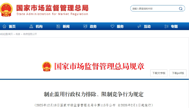12月26日晚,据“市说新语”微信公众号消息,为强化制止滥用行政权力排除、限制竞争的反垄断执法,进一步完善公平竞争制度规则,推动有效解决不当干预市场竞争问题,维护公...