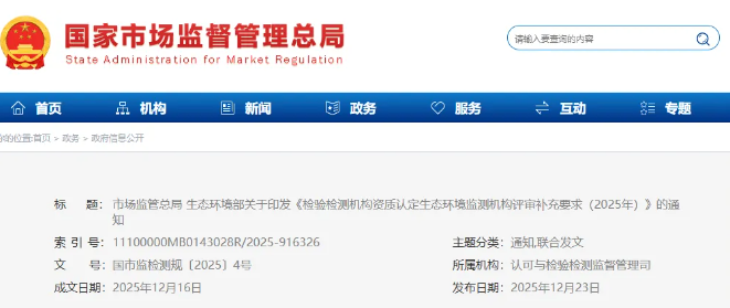 近日,市场监管总局联合生态环境部发布《检验检测机构资质认定生态环境监测机构评审补充要求(2025年)》(以下简称《补充要求》),进一步严格生态环境监测机构准入管理,筑牢生态环境监...