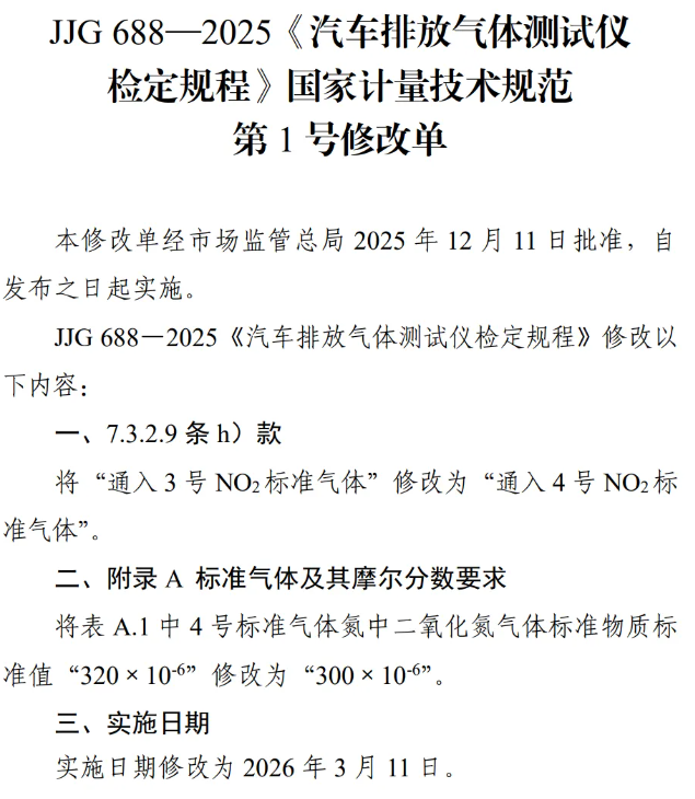 近日,市场监管总局批准发布JJG 688—2025《汽车排放气体测试仪检定规程》国家计量技术规范第1号修改单。详情如下: