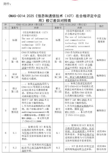 近日,中国合格评定国家认可委员会(CNAS)发布CNAS-CC14:2025《信息和通信技术(ICT)在合格评定中应用》,详情如下: