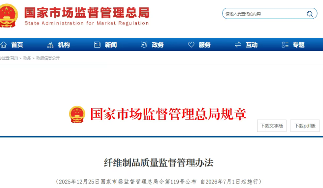 近日,市场监管总局修订出台了《纤维制品质量监督管理办法》(以下简称《办法》),自2026年7月1日起施行。《办法》对婴幼儿纤维制品、学生服、内衣、絮用纤维制品实施重点监管。本次修订将适用范围从原有的絮用纤维制品、学生服、面料三类产品,扩大至所有生活用纤维制品和非生活用絮用纤维制品。同时,明确一次性使用卫生用品、玻璃纤维制品、碳纤维制品等部分特殊用途的纤维制品,不适用本办法。