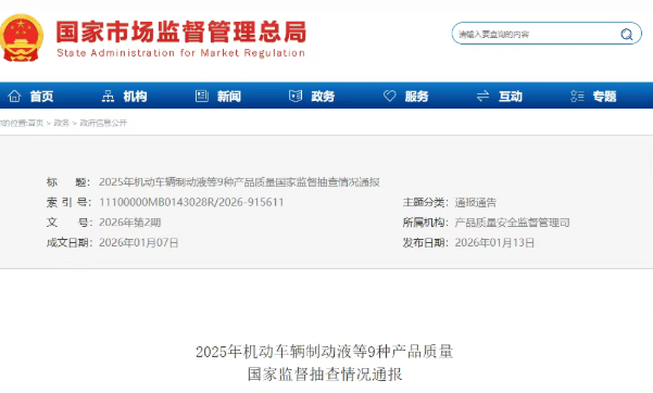 2025年机动车辆制动液等9种产品质量国家监督抽查情况通报