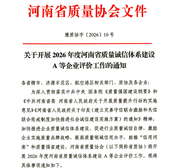 2026年度河南省质量诚信体系建设A等企业评价工作