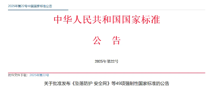 日前,国家市场监督管理总局(国家标准化管理委员会)批准发布《坠落防护 安全网》等49项强制性国家标准。