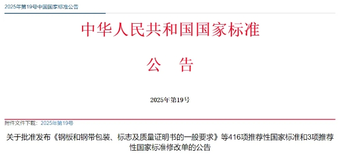 近日,国家市场监督管理总局(国家标准化管理委员会)批准发布《钢板和钢带包装、标志及质量证明书的一般要求》等416项推荐性国家标准和3项推荐性国家标准修改单。关于批准发布《...